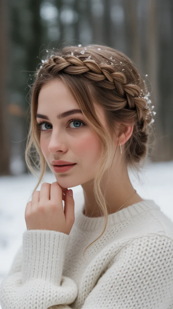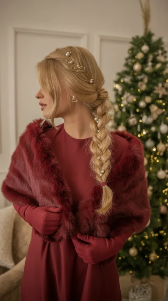 Add winter charm with ribbons, clips, or pearl pins woven into your braid for a festive touch.