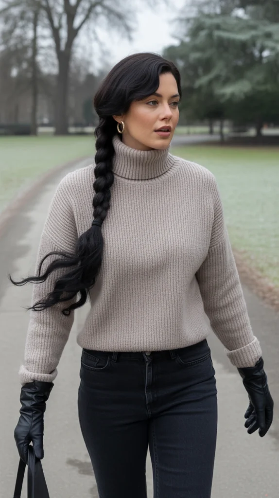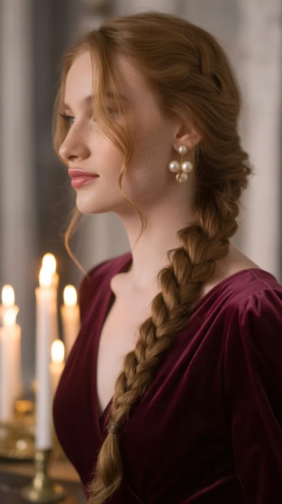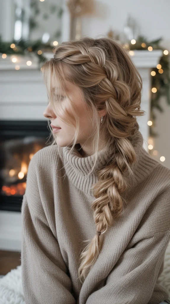 The side braid feels romantic and elegant, perfect for winter dinners or date nights. It’s a soft, feminine touch to your look.